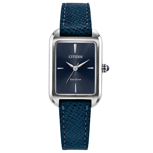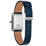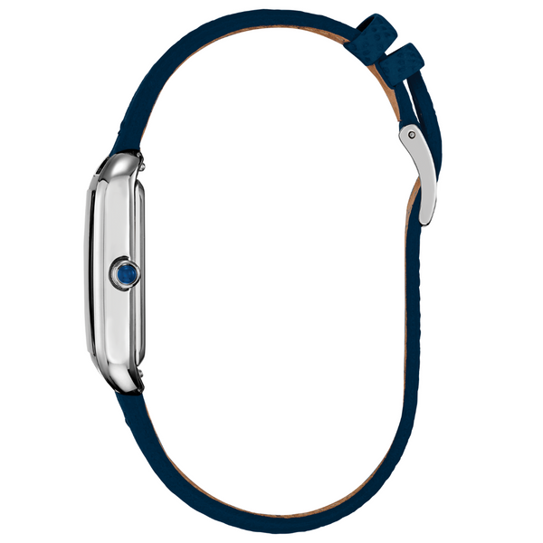 A 23.5mm case with curved lugs centres the chic design, with the silver-tone stainless steel contrasting against the blue of the textured leather strap and the blue of the synthetic sapphire-set crown.