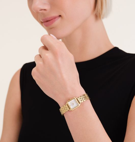 The Boxelle is a brand-new style, from the case to the dial and strap. The rectangular thicker case brings a touch of sophistication, while the dual finishes on the dial add a modern flair. The gold link bracelet bring in a feminine touch to your look and is easy to adjust to any wrist with sliding closure.