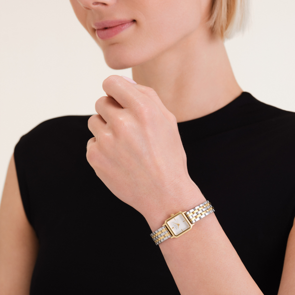 The Boxelle is a brand-new style, from the case to the dial and strap. The rectangular thicker case brings a touch of sophistication, while the dual finishes on the dial add a modern flair. The gold and silver coloured duotone link bracelet bring in a feminine touch to your look and is easy to adjust to any wrist with sliding closure.