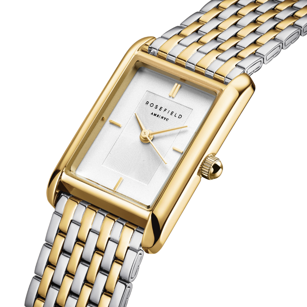 The Heirloom Duotone Watch is the Rosefield's newest iconic two tone style. The polished timepieces with glossy mixed metal link bracelets exude "understated luxury."