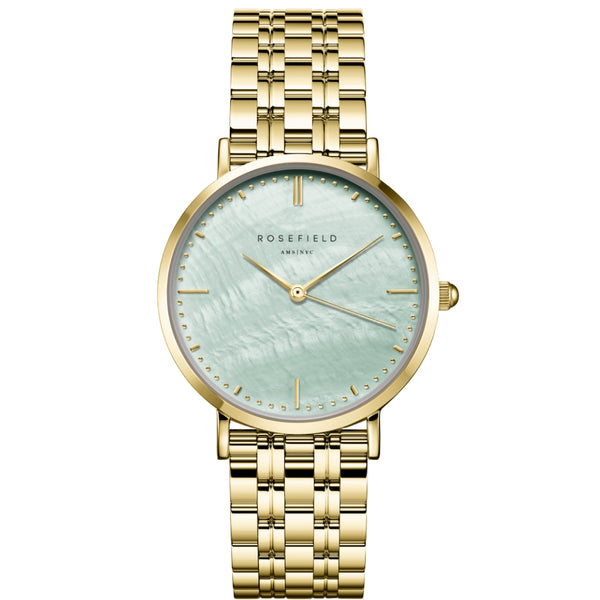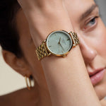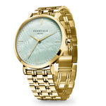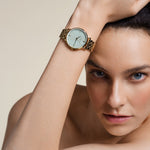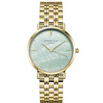 Featuring a 33mm round case with mint green mother of pearl dial, covered with mineral glass. The watch is made of durable metals, combined with a shiny polished five link steel strap.