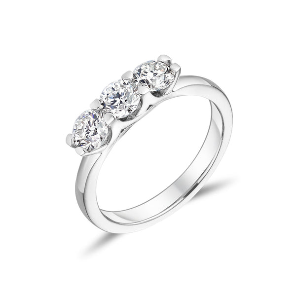 An elegant and timeless three stone diamond ring set in a tapered 18ct white gold band. The three round brilliant cut diamonds are perfectly matched in size and quality. The total diamond weight is 1.07ct.