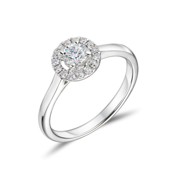 An elegant design featuring a round brilliant cut diamond surrounded by a shimmering halo. Made from 18ct white gold, the delicate halo perfectly captures the beauty of the principal diamond. The total diamond weight is 46 points.