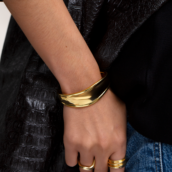 Inspired by sculptural shapes, this maximalist cuff bracelet features a domed design with ridge detailing. Crafted from 18ct gold plated on sterling silver, let it shine solo to make a statement.