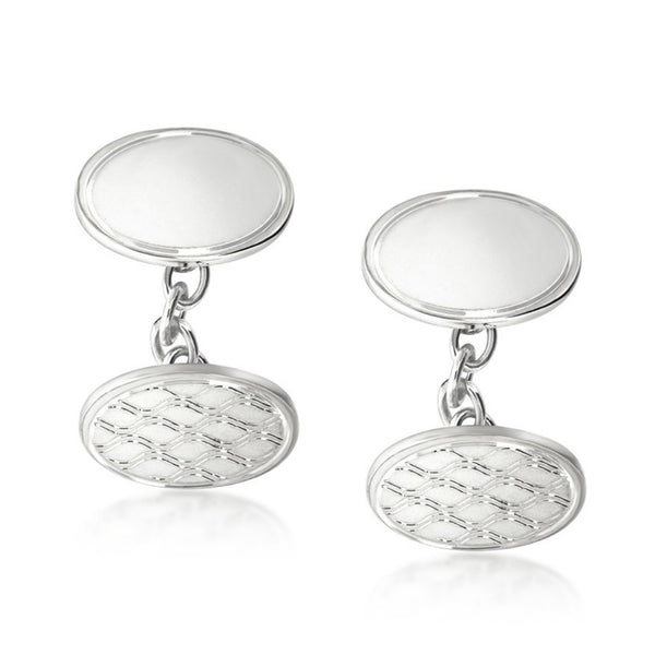 Our oval patterned silver cufflinks feature an intricate design on one side and plain, polished silver on the other. The sleek cable chain fastening ensures they stay secure. Have yours personalised for a bespoke touch.