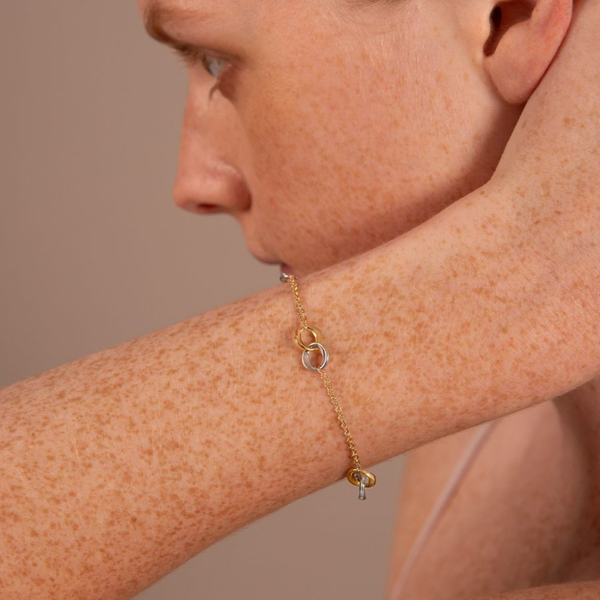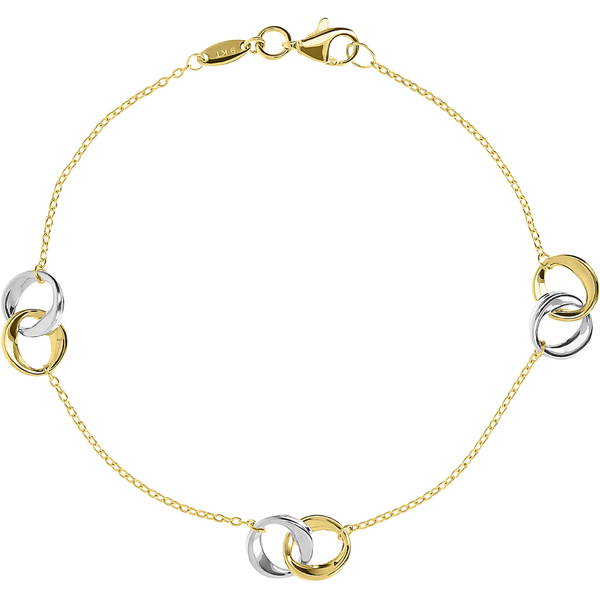 Mix your metals. This everyday mixed metal bracelet is the perfect starting point for your arm stack. Designed with interlocking 9ct white gold and 9ct yellow gold circles, interspersed with a 9ct gold delicate chain, it's a classic style that will never date.