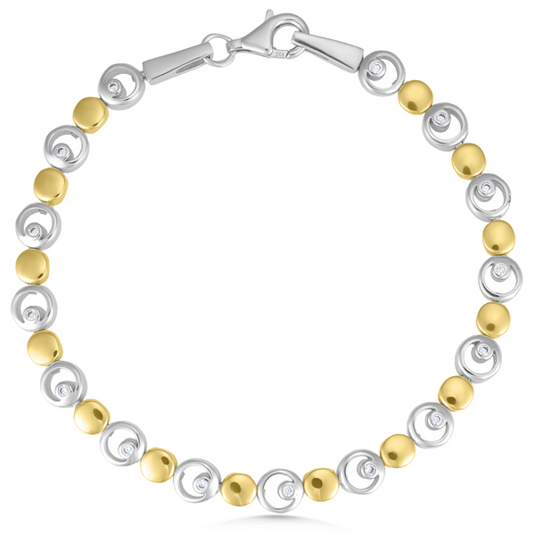 Mix your metals. A standout two tone bracelet, featuring silver links set with glittering cubic zirconias, alongside high polished gold flat beads. Wear solo or pair with your favourite delicate bracelets.
