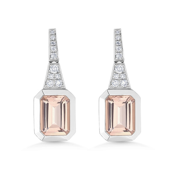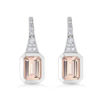 Crafted from 18ct white gold, our Morganite & Diamond Drop Earrings feature 1.60-carats of emerald cut morganite gemstones, bezel set and paired with 0.20-carats of round brilliant cut natural diamonds.