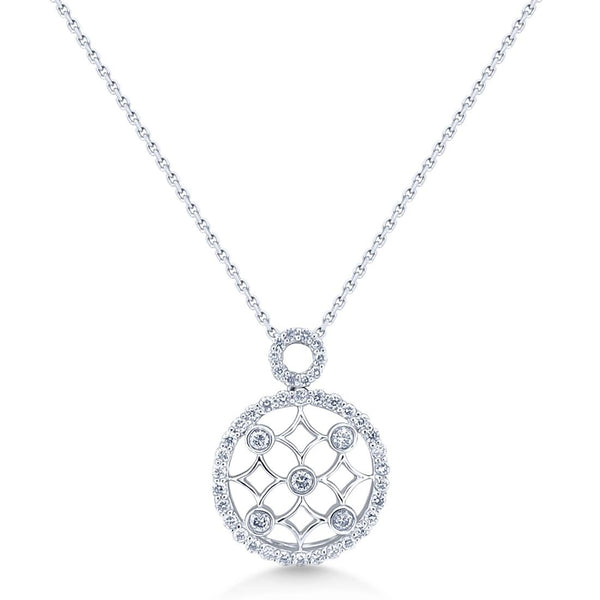 Crafted from 18ct white gold and strung from a fine chain, this intricately designed pendant sparkles with bezel and pavé set white diamonds, totalling 0.66-carats. Wear with other fine white gold jewellery for a sophisticated look.