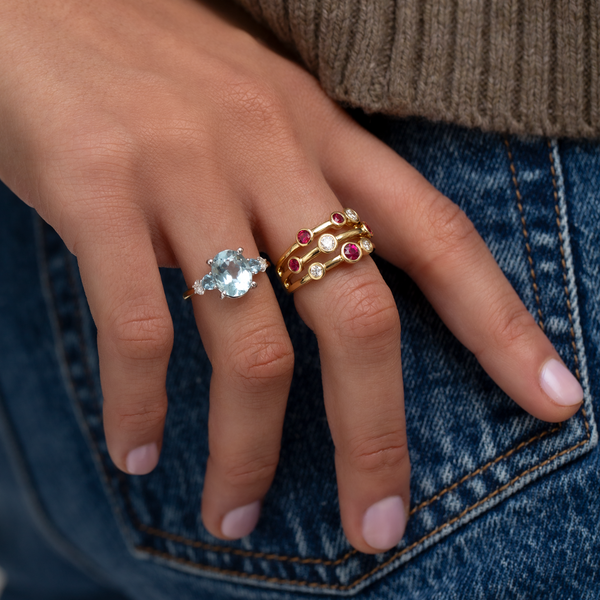 An oval cut 2.70ct aquamarine is accented by two smaller aquamarines and natural diamonds in a white gold setting, complete with an 18ct yellow gold band.