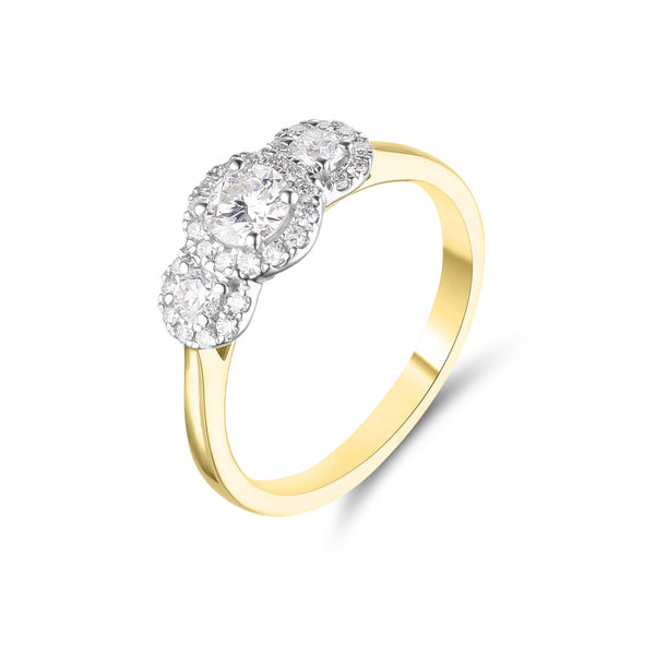 Crafted from 18ct yellow gold, this beautiful trilogy ring features three round brilliant cut diamonds, each surrounded by a halo of glittering diamonds in a white gold setting. The total diamond weight is 0.66ct.